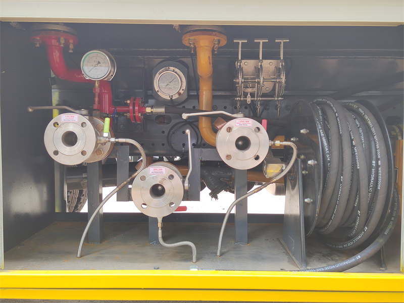 Εξαρτήματα δεξαμενής: Το φορτηγό ανεφοδιασμού LPG HOWO είναι εξοπλισμένο με ένα πλήρες σύστημα πλήρωσης που περιλαμβάνει αντλία, μετρητή ροής, καρούλι εύκαμπτου σωλήνα και βαλβίδα διακοπής έκτακτης ανάγκης, μαζί με απαραίτητα αξεσουάρ ασφαλείας όπως μετρητή στάθμης, θερμόμετρο, μετρητή πίεσης και βαλβίδα ασφαλείας.