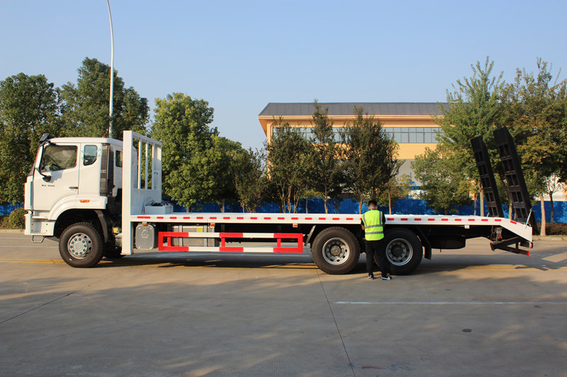 Ένα φορτηγό αυτοφόρτωσης, γνωστό και ως φορτηγό μεταφοράς με επίπεδη πλατφόρμα, φορτηγό αυτοφόρτωσης, φορτηγό μεταφοράς εκσκαφέα, είναι ένα εξειδικευμένο φορτηγό σχεδιασμένο για τη μεταφορά βαρέων μη αποσυναρμολογημένων μηχανημάτων κατασκευών, όπως εκσκαφείς και φορτωτές. Τα βασικά χαρακτηριστικά του περιλαμβάνουν ένα υδραυλικά επεκτεινόμενο επίπεδο κατάστρωμα και εξοπλισμό αυτοφόρτωσης όπως υδραυλικά πόδια στήριξης, βαρούλκα και ράμπες. Χάρη στο πλαίσιο υψηλού φορτίου και την αντιολισθητική, ενισχυμένη δομή καταστρώματος, επιτρέπει την ασφαλή και αποτελεσματική μεταφορά και την ανεξάρτητη φόρτωση/εκφόρτωση μεγάλου εξοπλισμού σε εργοτάξια, ορυχεία και κόμβους logistics, μειώνοντας την εξάρτηση από εξωτερικά μηχανήματα ανύψωσης. Λαμβάνοντας ως παράδειγμα το φορτηγό αυτοφόρτωσης με επίπεδη πλατφόρμα SINOTRUK HOWO 25 τόνων, αυτό το όχημα ενισχύει τις επαγγελματικές δυνατότητες μεταφοράς βαρέων οχημάτων με έναν κινητήρα Weichai 380 hp και άξονες κίνησης βαρέως τύπου. Η επίπεδη πλατφόρμα του μπορεί να επεκταθεί υδραυλικά έως 3 μέτρα σε πλάτος και είναι εξοπλισμένη με μπροστινά υδραυλικά στηρίγματα 25 τόνων και ένα βαρούλκο 8 τόνων, παρέχοντας εξαιρετική αξιοπιστία, απόδοση φέρουσας ικανότητας και απόδοση αυτοφόρτωσης ακόμη και υπό δύσκολες συνθήκες εργασίας.