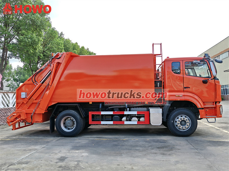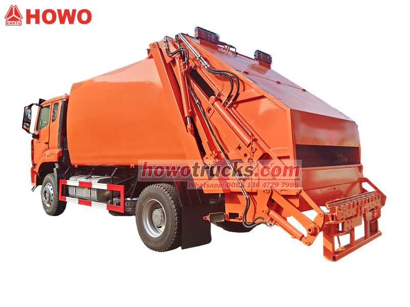 Το συμπιεστικό φορτηγό απορριμμάτων Howo χρησιμοποιεί Fast 10 ταχύτητες εμπρόσθιας κίνησης και 2 ταχύτητες όπισθεν. Σε συνδυασμό με ένα στιβαρό πλαίσιο και ένα ευέλικτο σύστημα διεύθυνσης, εξασφαλίζει σταθερή και αποτελεσματική λειτουργία σε σύνθετες οδικές συνθήκες. Το 15 CBMΗ καμπύλη δεξαμενή, κατασκευασμένη από ειδικό χάλυβα Q235 πάχους 4 mm, χρησιμοποιεί μια μονοκόμματη διαδικασία χύτευσης, με αποτέλεσμα λόγο συμπίεσης 1:3,4, εξασφαλίζοντας μέγιστη απόδοση συμπύκνωσης απορριμμάτων. Το πλήρως αυτόματο υδραυλικό σύστημα ελέγχου μειώνει τους κύκλους φόρτωσης και εκφόρτωσης σε 40-45 δευτερόλεπτα. Εξοπλισμένη με έξυπνο σύστημα ελέγχου PLC, είναι εύκολη και γρήγορη στη λειτουργία. Στη χειροκίνητη λειτουργία, ο χειριστής μπορεί να χρησιμοποιήσει τον μοχλό λειτουργίας και τα ηλεκτρικά κουμπιά ελέγχου για να ολοκληρώσει τη συμπίεση, την εκφόρτωση και άλλες λειτουργίες του χώρου απορριμμάτων.
