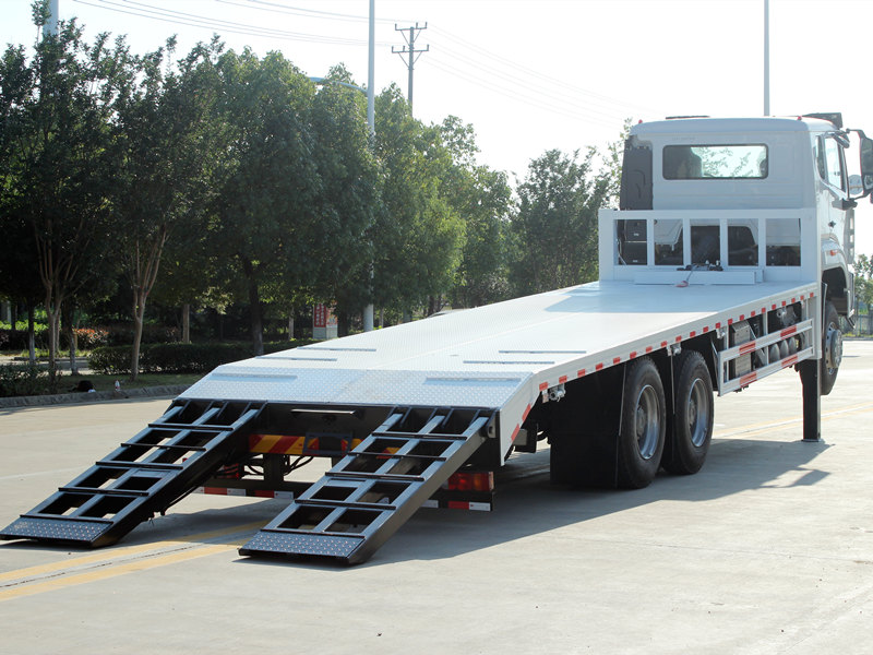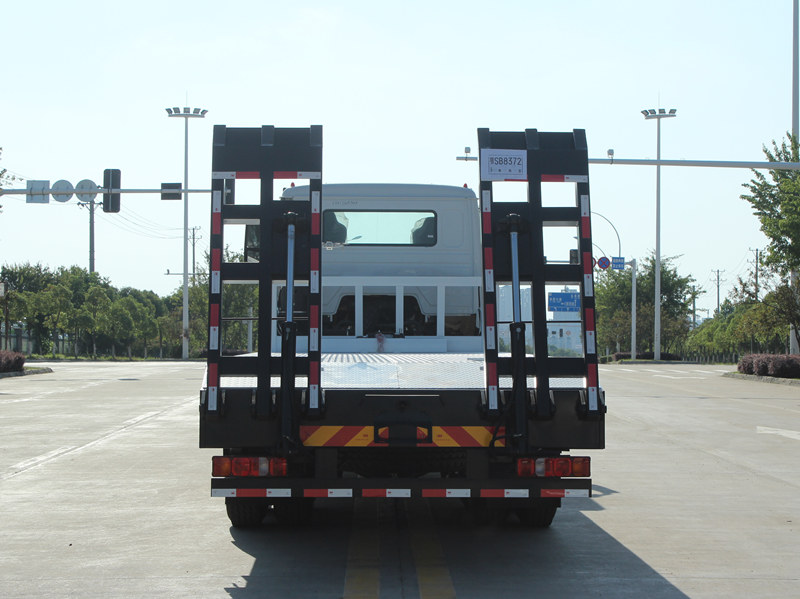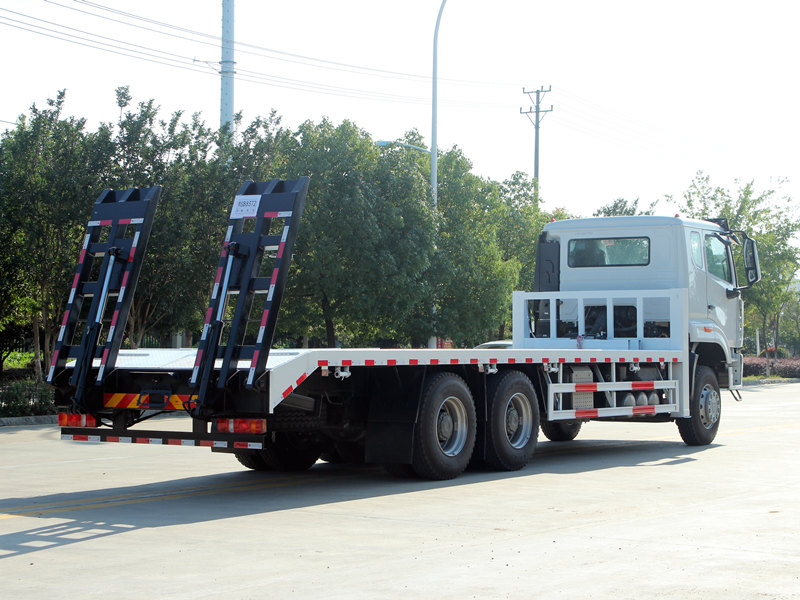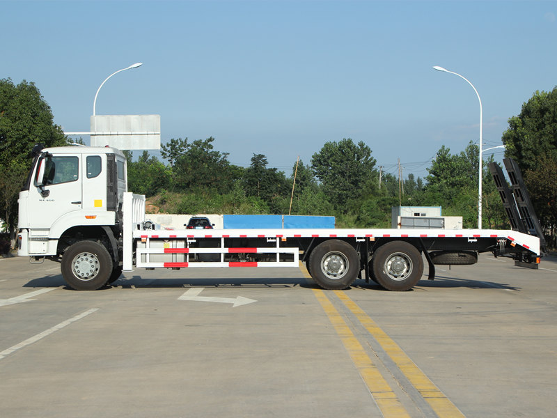 Αυτό Φορτηγό αυτοφόρτωσης HOWO NX είναι εξοπλισμένο με επαγγελματικά και ισχυρά χαρακτηριστικά. Η πλατφόρμα είναι κατασκευασμένη από αντιολισθητικές χαλύβδινες πλάκες πάχους 8 mm, διαστάσεων 8600×2500 mm, ειδικά σχεδιασμένες για την ασφαλή μεταφορά μεσαίου μεγέθους εκσκαφέων και άλλου εξοπλισμού. Το πίσω μέρος του οχήματος είναι εξοπλισμένο με δύο υδραυλικές ράμπες μήκους 2 μέτρων για να διευκολύνει την εύκολη φόρτωση και εκφόρτωση μηχανημάτων. Επιπλέον, δύο μπροστινά υδραυλικά υποστηρίγματα ανύψωσης, το καθένα με ικανότητα ανύψωσης 20 τόνων, ενισχύουν σημαντικά τη σταθερότητα κατά τη διάρκεια εργασιών σε ανώμαλο έδαφος. Ένα υδραυλικό βαρούλκο 4 τόνων είναι επίσης εγκατεστημένο στο μπροστινό μέρος, χρησιμοποιήσιμο για εργασίες ανάκτησης ή ασφάλισης εξοπλισμού, καλύπτοντας πλήρως τις απαιτήσεις των Φιλιππινέζων χρηστών για ευελιξία και αξιοπιστία.